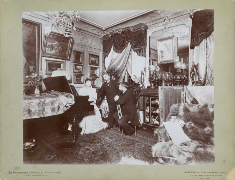 In the Salon: Mallarmé and the painter Henri Gervex. "Le salon que tient Méry Laurent est un lieu d’échanges qui favorise les démarches créatrices de ceux qui le fréquentent : on y rencontre des peintres, tels qu’Édouard Manet ou Henri Gervex, des poètes et des écrivains comme Mallarmé, Coppée, Huysmans, Proust (l’auteur brosse son portrait en la personne d’Odette de Crécy, le plus grand amour de Swann8) ou Zola (qui s’inspire d’elle pour Nana), des sculpteurs, des artistes lyriques et des musiciens, tels qu’Hortense Schneider ou Reynaldo Hahn. Celui-ci sera d’ailleurs son exécuteur testamentaire."